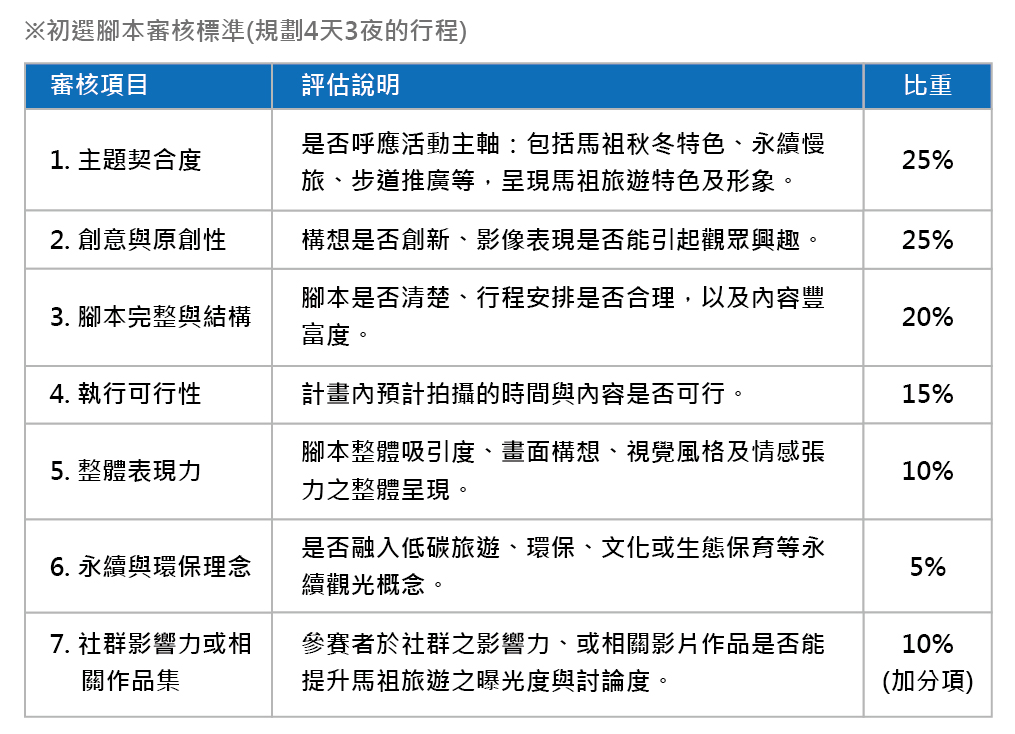 - 參賽腳本以 PDF 電子檔遞交,應附行程規劃及拍攝理念,請以直式橫書繕打;參賽作品僅供 115年「藍色創意航線-短影音挑戰活動」腳本徵選活動之評審使用。
