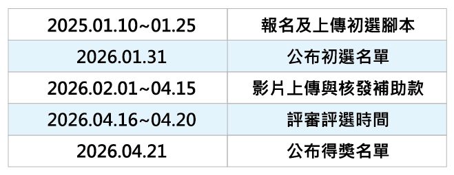 徵件報名→初選評審會議(腳本審查) →公布入圍名單→入圍者拍攝影片→影片繳交後3日內發放補助款→決選評審會議→公佈決選名單。